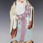 A Chinese famille rose porcelain figure of Shoulao, 20th century, modelled standing wearing a colourful robe and holding a scroll, unmarked, height 58.5cm, with carved wood stand.