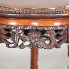 A Chinese hardwood jardinière stand, early 20th century, the lobed circular top with carved border and beaded edge, above a carved and pierced dragon frieze, on carved dragon legs united by an undertier, diameter 56cm, height 58cm.