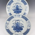 A near pair of Chinese blue and white porcelain circular charger dishes, late Qing dynasty, each painted with a lotus-filled flower basket within a border of flower vignettes and trellis, diameters 41.3cm and 40.3cm (one with star hairline crack and minor chips).