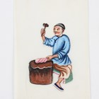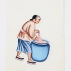A set of six Chinese Canton export watercolour paintings on rice paper, late 19th century, each depicting a figure involved in silk manufacture, 10.8cm x 7.2cm, within a silk mounted case with glazed cover.
