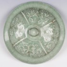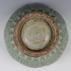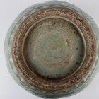A Chinese celadon glazed wine jar and cover, Ming style but later, the compressed circular body decorated in relief with panels of flowers and leafy tendrils, repeated on the domed cover, all beneath a pale green glaze, height 24.5cm. Provenance: the property of a West Sussex private collector.