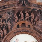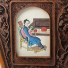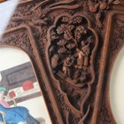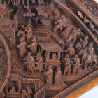 A Chinese Canton export sandalwood fan shaped frame, mid to late 19th century, carved in high relief with a processional scene and smaller figural vignettes, surrounding five apertures inset with watercolour paintings depicting figural scenes, length 82cm, framed and glazed.