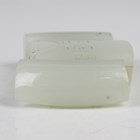 A Chinese pale celadon jade belthook and buckle, probably 20th century, the belthook of typical serpentine form with carved dragon head terminal, length 9.6cm, the buckle of scroll form and incised with four characters, length 8.3cm.