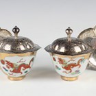 A pair of Chinese porcelain teabowls with silver covers and stands, mid-20th century, each bowl painted with dragons and fenghuang reserved against a gilt ground, the silver covers and stands of petal outline with engraved decoration, total height 10cm.