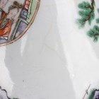 A Chinese famille verte and floral incised porcelain bottle vase, mark of Xuande but Qing dynasty, the ovoid body painted with figures and pine trees in a rocky landscape, iron red enamelled four-character mark to base, height 25.5cm (reduced neck, drilled hole near base and hairlines).