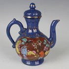 Two Chinese blue enamelled Yixing stoneware teapots and covers, early 20th century, each decorated with relief moulded figural panels picked out in polychrome enamels, heights 16.2cm and 17.8cm (one with chip to rim, the other with chip to cover).