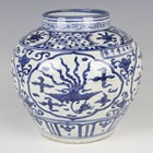 A Chinese Ming style blue and white porcelain jar, mark of Wanli but later, of stout compressed ovoid form, painted with four alternating panels of dragons and phoenixes, centred with a six-character mark to the shoulder below a trellis and flower vignette band, height 23cm.