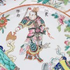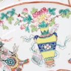A Chinese Canton famille rose porcelain oval meat dish, mid-19th century, painted with four figures and black characters divided by precious vessels within a rim of precious objects and bird and flower vignettes, length 43cm.