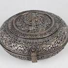 A South-east Asian white metal and parcel gilt circular box and cover, probably Tibetan or Chinese Straits, of flattened circular form, cast in relief with bands of scrolling foliage, lappets and ruyi heads, heightened in gilt, within beaded borders, the hinged lid with foliate surmount, unmarked, weight 850.4g, height 8.5cm, diameter 18cm.