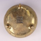 A Chinese polished bronze tripod censer, mark of Xuande but 19th century, of compressed circular form with a pair of upright loop handles, on three short feet, cast six-character seal mark to base, weight 1105.2g, height 12.2cm, rim diameter 14.8cm, width across handles 16.9cm.