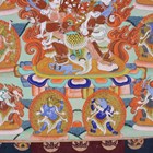 A Tibetan thangka, early 20th century, painted on fabric and laid on board, depicting Mahakala in yab-yum with his consort within a surround of bodhisattvas in yab-yum and various other deities, 70cm x 47cm.