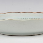 A Chinese export porcelain bowl, Qianlong period, of shaped oval form, painted with a circular puce landscape vignette within scattered flower and green bellflower border, length 33.2cm, together with a matching circular bowl, diameter 26cm (minor rim chips/glaze fritting).