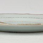 A Chinese export porcelain part dinner service, Qianlong period, each piece painted with circular puce landscape vignettes within scattered flower and green bellflower borders, comprising two circular bowls, diameter 26.5cm, a smaller bowl, diameter 23.2cm, a meat strainer, length 35.5cm, four plates, diameter 23.5cm, and a soup plate, diameter 23.5cm (all with faults).