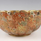 A Japanese Satsuma earthenware bowl by Seikozan, Meiji period, of lobed circular form, the interior finely painted and gilt with a continuous scene of figures in landscape below a border of wisteria, the centre and exterior with millefleurs, iron red and gilt signature to base, height 10.7cm, diameter 21.3cm (restoration).