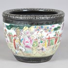 A Chinese porcelain jardinière, modern, decorated with a continuous figural scene within black glazed borders, height 33cm.