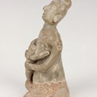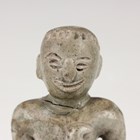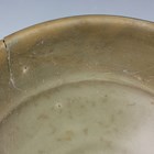A Chinese celadon glazed circular dish, Ming dynasty, the centre carved in low relief with lotus, diameter 25cm (repaired and restored), together with three Thai celadon glazed pottery funerary figures, 16th century, each in a kneeling pose, heights 9.6cm, 10.5cm and 12.1cm (faults).