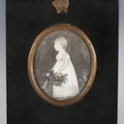 Circle of Catharine da Costa - Oval Miniature Full Length Profile Portrait of a Young Child wearing a White Gown and holding a Basket of Flowers, 18th century watercolour on ivory, 8.5cm x 6.5cm, within an ebonized frame with metal mounts, together with two other miniatures.