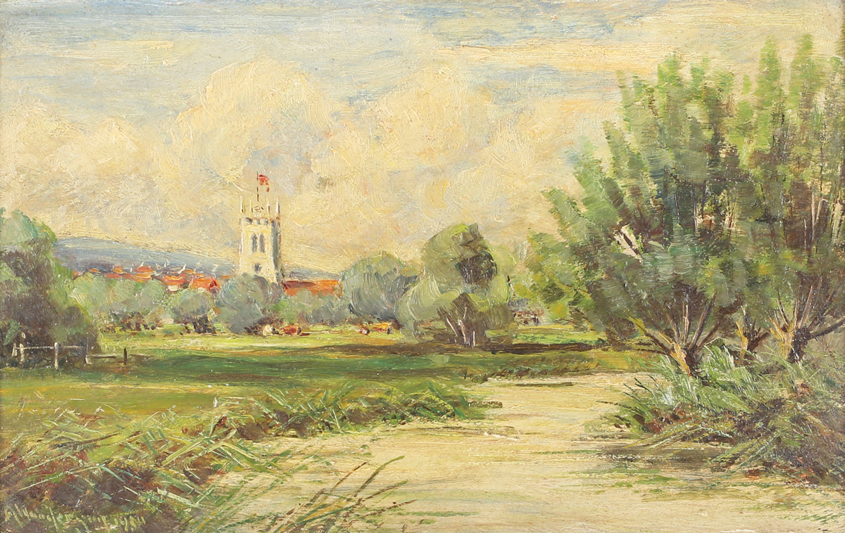 British School - 'Farnham Church from the Meadows', early 20th century oil on board, indistinctly signed and dated recto, titled label verso, 17.5cm x 27.5cm, within a gilt composition frame.