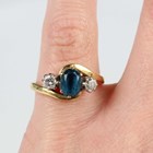 An 18ct gold ring, claw set with an oval cut treated dark blue topaz between two circular cut diamonds in a twistover design, London 1992, weight 3.8g (shank distorted).