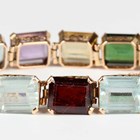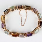 A gold and varicoloured gemstone bracelet, circa 1940, claw set with various rectangular cut gemstones including amethyst, aquamarine and garnet, unmarked, weight 39.2g, length 18.5cm.