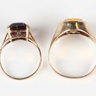 A 9ct gold ring, mounted with an oval faceted synthetic yellowish orange sapphire, Birmingham 1973, ring size approx S1/2, and a gold and rectangular mauve paste ring, detailed '9ct gold', ring size approx N, total weight 9.2g.