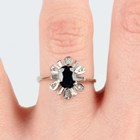 An 18ct white gold ring, claw set with an oval cut sapphire within a surround of six small diamonds in a flowerhead shaped design, London 1978, weight 3.2g, ring size approx K.
