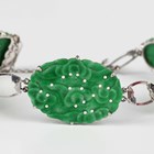 A jade bracelet, mounted with a row of five oval carved and pierced jade panels, on a snap clasp, fitted with a safety chain, unmarked, weight 11.7g, length 18.5cm.
