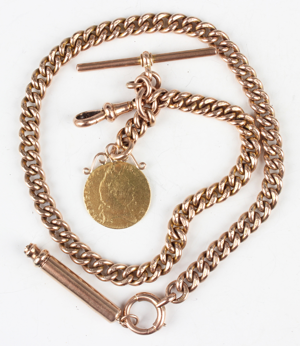 A 9ct gold curblink Albert watch chain, each link stamped '9' and '.375', fitted with a T-bar, a swivel and a boltring clasp, weight 54g, total length 37.2cm, hung with a half-guinea pendant and a 9ct gold cased propelling pencil.
