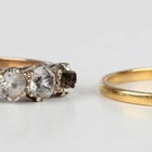 A 22ct gold wedding ring, indistinct mark, weight 1.7g, ring size approx O, and a gold ring, mounted with two synthetic white sapphires, detailed '9ct', weight 2.3g, ring size approx N1/2 (one gemstone lacking).