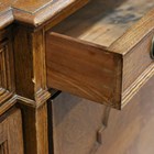 An early 20th century oak breakfront bookcase cabinet, the dentil pediment above astragal glazed doors, drawers and cupboards, height 227cm, width 190cm, depth 52cm.