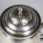 A George V Arts and Crafts hammered silver two-handled cup and cover with lappet decoration and spiral finial above a similarly decorated ovoid body, flanked by two beaded scroll handles, on a circular foot, London 1927 by D. & J. Wellby Ltd, weight 393.7g, height 17cm.