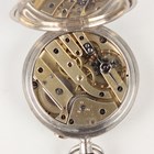A group of four silver keyless wind open-faced ladies' fob watches, each with enamelled dial and black Roman hour numerals, case diameters ranging from 3.5cm to 3.9cm.