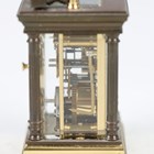 A late 20th century French brass cased diminutive carriage alarm clock by L'Epee, the eight day movement with platform escapement, the signed enamel dial with Roman hour numerals and subsidiary alarm dial, the glazed case with fluted swing handle and corner columns, on a stepped base, height 10.9cm, with winding key.