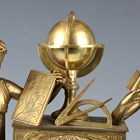 An early 19th century French Empire style ormolu mantel clock, the eight day movement with silk suspension striking on a bell via an outside countwheel, the gilt circular dial with Roman hour numerals, the case modelled with two classical youths standing either side of a bookcase, reading a map and book, with globe, dividers and protractor between, the rectangular plinth cast with a relief frieze of two cupids and scientific instruments above a moulded foliate band, on rosette moulded scroll feet, height 42cm, with pendulum.