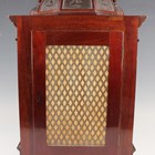 An impressive late Victorian mahogany bracket clock with eight day triple fusee movement chiming quarters on eight bells or four gongs and striking hours on a larger gong, the floral engraved gilt dial with silvered subsidiary chime/silent, pendulum regulation and chime selection dials above a silvered chapter ring with Arabic hour numerals, all within a pierced and engraved gilt floral and foliate scroll surround, the case with domed top, carved with foliate surmount and bellflower pendant panels, flanked by a pair of reeded finials, the stepped arch pediment with carved mask and foliate scroll frieze, above a glazed door, flanked by carved Ionic capital and bellflower corner columns, the sides with pierced fret panels, on a stepped and moulded plinth base, height 58cm, with pendulum, winder and case keys, together with a matching mahogany wall bracket, height 34.2cm.