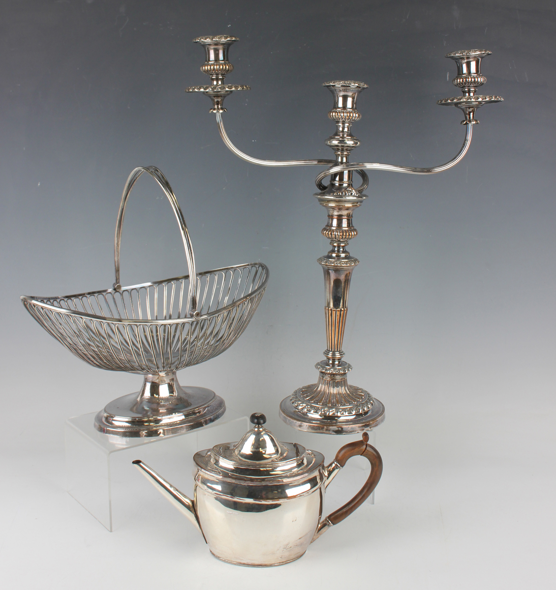 A 19th century Sheffield plate oval wirework basket with swing handle, on an oval pedestal foot, length 33.7cm, together with a Sheffield plate twin-branch three-light candelabrum, height 47cm, and a Sheffield plate oval teapot.