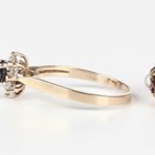 An 18ct white gold and diamond ring in a twist design, mounted with circular cut diamonds, detailed 'DIA 18K', weight 1.7g, ring size approx J1/2, a 9ct gold, garnet and cultured pearl half hoop ring, London 1979, a 9ct gold, opal and garnet oval cluster ring (one garnet lacking), total weight 4.8g, a gold, sapphire and diamond oval cluster ring, detailed '10K', and a gold, sapphire and diamond seven stone half hoop ring, detailed '10K', total weight 2.6g.
