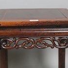 A pair of 19th century Chinese hardwood lamp tables, the square tops above pierced friezes and block legs, height 51cm, width 44cm, depth 45cm.