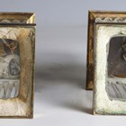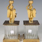 A pair of late 19th/early 20th century gilt bronze figural candlesticks, each cast as a kneeling cherub raised on a ribbed clear glass pedestal, height 23cm.