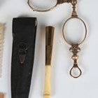 A pair of Victorian gilt metal folding lorgnettes with engraved decoration, a bone handled desk seal, a Victorian gold cased hexagonal slide-action pencil with engraved decoration and sardonyx shield shaped terminal, a gold mounted bone cigarette holder with engine turned decoration, detailed '18cr', with a case, a slide-action toothpick, a miniature agate tankard and a few further items, including tortoiseshell and mother-of-pearl.