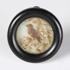 An early 20th century French gilt metal and imitation tortoiseshell mounted hand mirror, length 23cm, together with a 19th century papier-mâché snuff box, a hairwork miniature of a bird and a colourless paste set bracelet.
