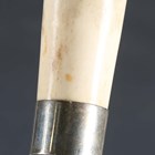 A late 19th century Malacca walking cane with carved rhinoceros horn handle, mounted with a 9ct gold collar, length 91cm, and an early 20th century ebonized hardwood walking cane with antler handle and silver collar, length 91.5cm. Note: as this lot incorporates rhinoceros horn, it would be very unlikely that a re-export certificate would be granted beyond the UK. Customers outside the UK are requested NOT to bid on this item.