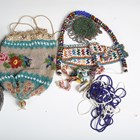 An Art Deco black silk and marcasite beadwork purse, length 20cm, together with a group of other beadwork, including four further purses.
