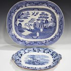 A William Adams Flowers and Leaves Border Series Plas-Newydd Wales blue printed meat dish or platter, early 19th century, length 43cm, together with a mixed group of Staffordshire blue printed wares, mostly 19th century, including an Antique Scenery Cathedral Church of Glasgow tree and well meat dish, three drainers and four jugs, including a Ridgway Oriental Birds jug, height 17.5cm (faults and restoration). Provenance: the property of Donald Church.
