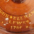 A Sussex Dicker pottery harvest jug or flagon, dated '1786' but early 20th century, of bulbous shape with loop handle, inscribed to the shoulders in ochre 'JOHN ELLMAN LEWES 1786' amidst scattered stars, against the brown glazed body, impressed mark to base, height 21cm.