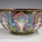 A Wedgwood Fairyland lustre octagonal bowl, 1920s, decorated with the Geisha or Angels pattern to the exterior, and Running Figures to the interior, gilt printed Portland Vase mark to base with pattern number 'Z4968', diameter 16cm. Provenance: purchased from Madelena Antiques.
