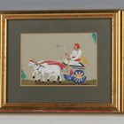 A group of three Indian paintings on mica, late 19th century, two depicting a maharaja transported by a litter carried by four attendants, the other with an ox-drawn carriage, 9cm x 13.5cm, framed and glazed.