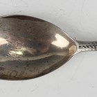 A George IV silver Fiddle pattern basting spoon, London 1823 by John Meek, length 30cm, a silver bright-cut engraved caddy spoon with leaf shaped bowl, London 1797 by Thomas Wallis II, length 10cm, and a silver Fiddle pattern salt spoon, total weight 155.6g, together with a toddy ladle, the oval bowl inset with a George III shilling, with a twisted whalebone handle, length 29cm.