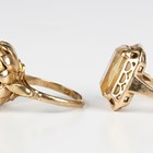 A 9ct gold and citrine ring in a flowerhead shaped design, London 1971, ring size approx N, and a 9ct gold ring claw set with a rectangular cut citrine, ring size approx L1/2, total weight 14.4g.