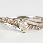 A 9ct white gold and diamond ring, mounted with the principal circular cut diamond between diamond set three stone tapered shoulders, detailed '0.17', weight 2.5g, ring size approx N, with a case.